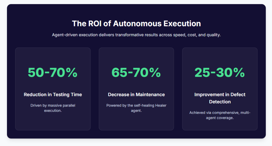 • Eliminate Maintenance Costs and Reallocate Talent: The Healer agent directly attacks the single largest hidden cost in most QA organizations: script maintenance. By automatically fixing broken tests, Healer allows organizations to reduce the time and effort spent on test script maintenance by an incredible 65-70%. This frees your most valuable engineers from low-value repair work, allowing you to reallocate their expertise toward innovation and complex quality challenges that truly move the needle.
