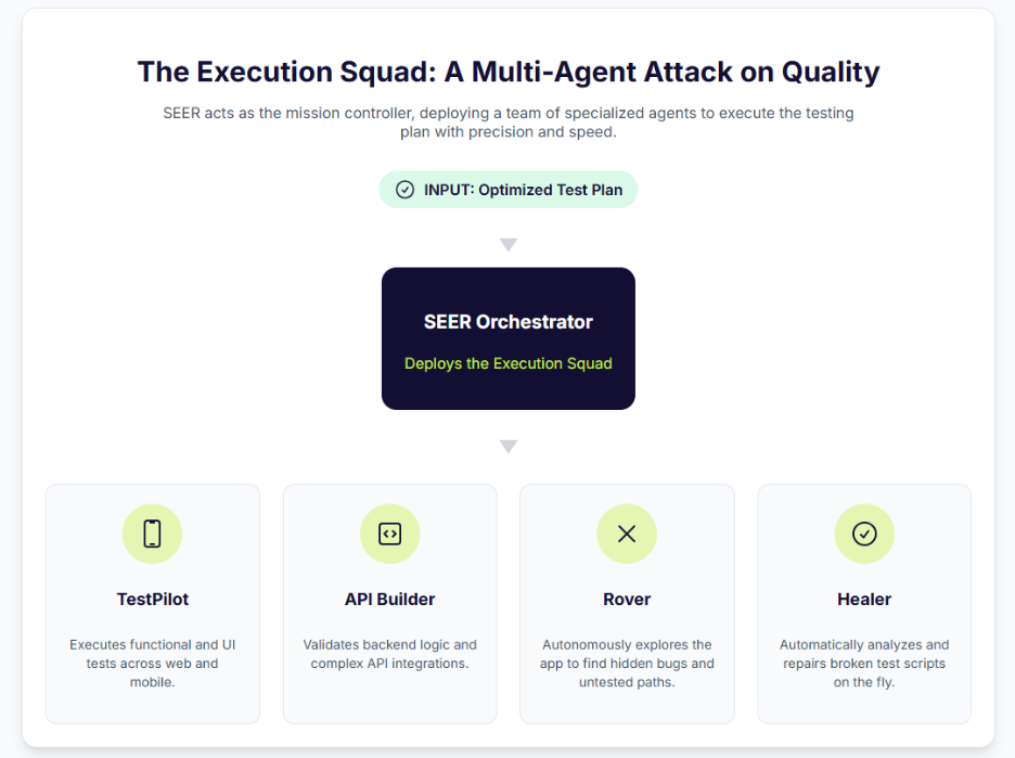 This is where the SEER framework truly shines. It doesn’t just run a script. It conducts a sophisticated team of specialized Single Use Agents (SUAs), launching an intelligent and targeted attack on quality. This is the dawn of true autonomous test execution, an approach that transforms QA from a siloed cost center into a strategic business accelerator.