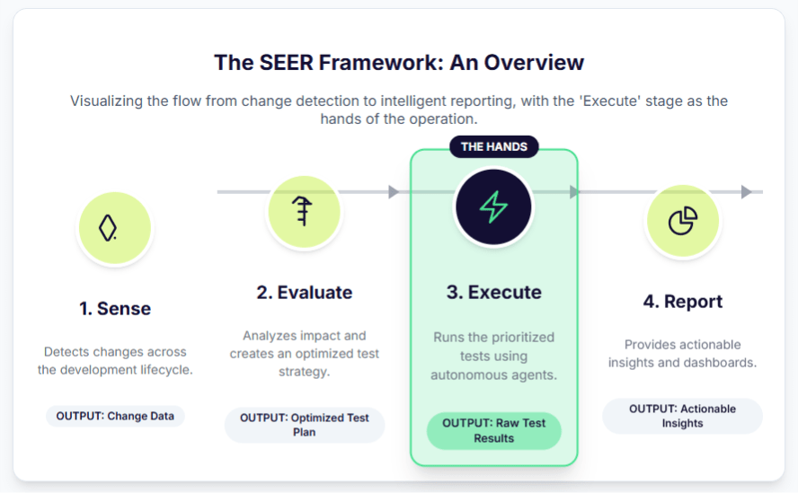Welcome to the fourth chapter of our Agentic Orchestration series. So far, we’ve seen how the Qyrus SEER framework uses its ‘Eyes and Ears’ to Sense changes and its ‘Brain’ to Evaluate the impact. Now, it’s time to put that intelligence into action. In this post, we’ll explore the ‘Muscle’ of the operation: the powerful test execution stage. If you’re new to the series, we recommend starting with Part 1 to understand the full journey.
