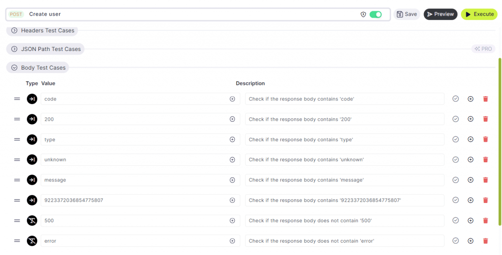 Under the ‘Test Cases’ tab, users are presented with options to define test cases for Header Assertions, and the body of the API request or response. This functionality allows for thorough testing and validation of various aspects of the API’s behavior, ensuring reliability and consistency in its performance.