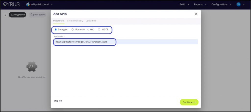 One efficient method of creating APIs is through URL imports. This process supports two primary formats: Swagger and WSDL*. Depending on your project’s specifications, you can choose the format that best aligns with your requirements.