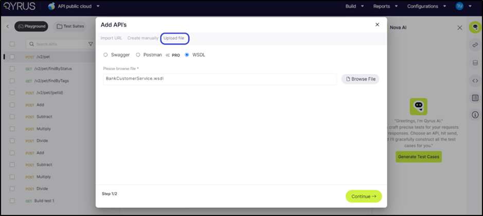 To manually upload the file, click on the Swagger or WSDL type, upload the respective type of file, and click on continue.