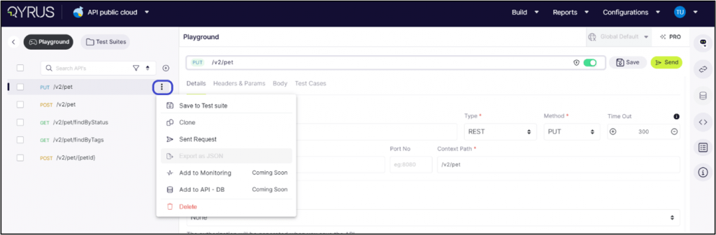 Step 1: Once the APIs are uploaded and tested, the user needs to add them to a test suite. Select the API, click on more options, and click on Save to Test Suite.