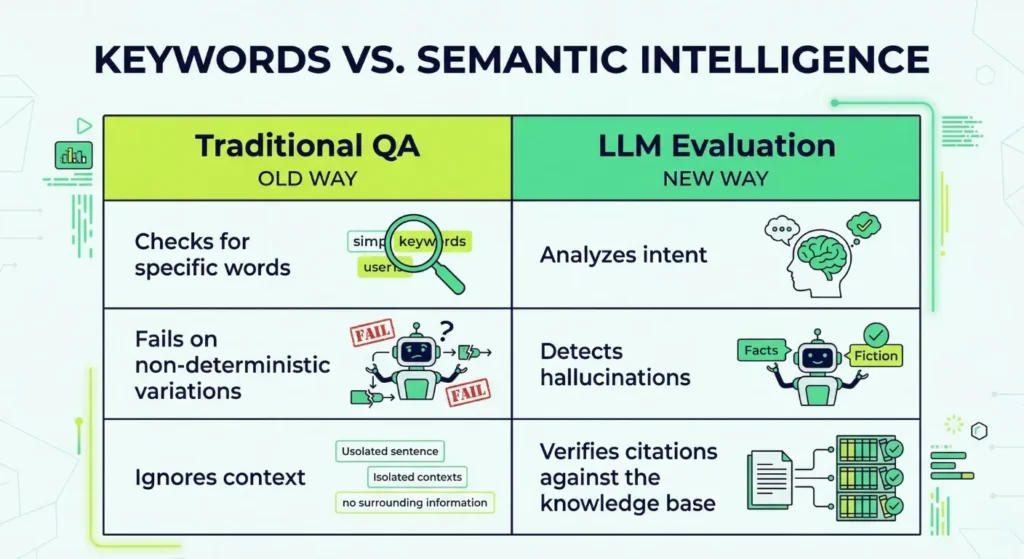 Traditional software testing relies on predictable, binary outcomes. If you input X, the system must return Y. LLMs behave non-deterministically. They produce thousands of variations for the same prompt. This unpredictability creates a massive challenge for AI output validation. If your quality assurance team relies solely on keyword matching, they will miss subtle but dangerous errors.