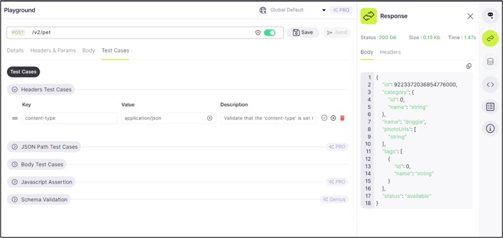On the Test Cases tab, users are presented with options to define test cases for headers assertions, and the body of the API request or response. This functionality allows for thorough testing and validation of various aspects of the API’s behavior, ensuring reliability and consistency in its performance.