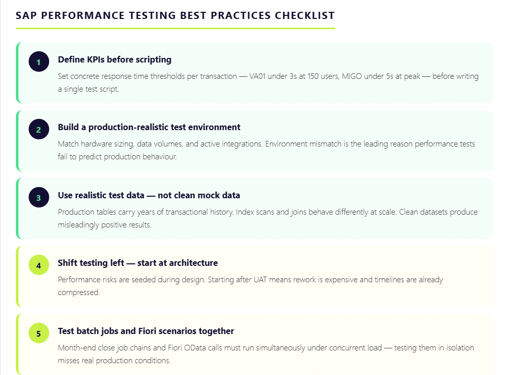 Having the right tools is only part of the equation. How you structure and execute your SAP performance testing program determines whether it actually protects your business — or just produces reports that look thorough without catching the issues that matter. These are the practices that separate testing programs that work from those that only appear to.