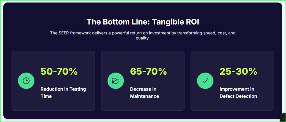 - Drastically Reduced Costs and Reallocated Talent: The autonomous, agent-driven nature of the SEER framework directly attacks the largest hidden costs in most QA organizations: maintenance and tool sprawl. By deploying the Healer agent to automatically fix broken scripts, organizations reduce the time and effort spent on test script maintenance by a staggering 65-70%. This frees your most valuable and expensive engineering talent from low-value repair work, allowing you to reallocate their expertise toward innovation and complex quality challenges.